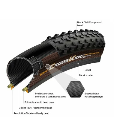 La cubierta Continental Cross King ProTection es un neumático versátil de competición y trail, muy seguro en los giros y cómodo. Buen agarre y disponible con varias tecnologías. Neumático de rodadura suave que se adapta a cualquier terreno con su dibujo especial.