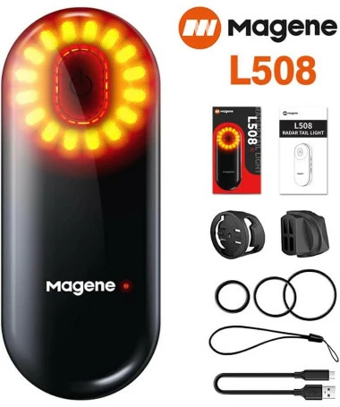 - El paquete incluye: Luz trasera de radar L508, 3 correas de goma, soporte de tija, manual de usuario, cable de carga tipo C, correa de seguridad.