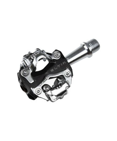 Pedales Eltin MTB para bicicleta de montaña compatibles con sistema SPD. Calas EPC6000 incluidas. Fabricado en aluminio revestido, eje de cromo, anclaje en las dos caras y tensión ajustable. Con tan solo 325 gramos, los pedales automáticos MTB de Eltin son unos pedales de montaña funcionales con un diseño muy cuidado.